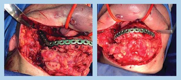 Materiales y métodos: bajo anestesia general e intubación nasotraqueal se realiza un abordaje submandibular y submental. Se realizó con sierra quirúrgica el corte de la porción mandibular afectada y la reconstrucción del contorno mandibular con una placa de 2.7.