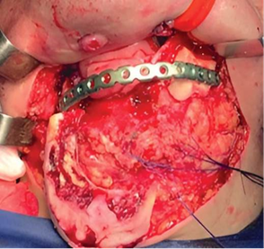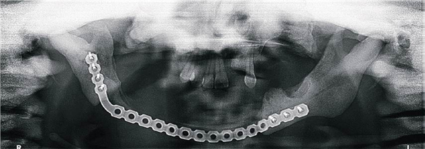 Materials and methods: Under general anesthesia and nasotracheal intubation a submandibular and submental approach was performed. The affected mandibular portion was cut with a surgical saw and the mandibular contour was reconstructed with a 2.7 plate.
