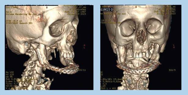 Con el archivo DICOM de la TC se realizó un biomodelo de la mandíbula para preformar la placa de reconstrucción y así disminuir los tiempos quirúrgicos.