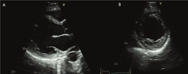 Figura 1. Ecocardiograma transtorácico. A-B: enfoque paraesternal eje largo y corto respectivamente que evidencia un ventrículo izquierdo moderadamente dilatado con pérdida de su geometría (remodelado esférico).