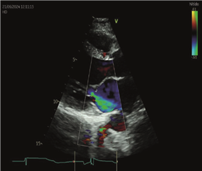 Figura 2. Ecocardiograma Doppler Transtorácico que muestra apicalización del cierre de la válvula mitral con tenting asimétrico que genera jet de regurgitación excéntrico de grado moderado.