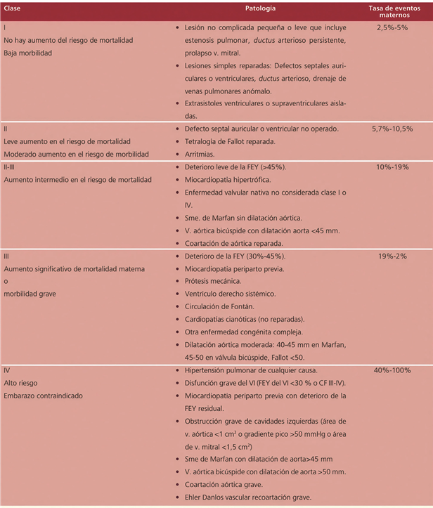 Existen diferentes clasificaciones pronósticas de riesgo de complicaciones maternas en embarazadas con patología cardíaca. La clasificación modificada de la Organización Mundial de la Salud (OMS) (tabla 1), es la que mejor se correlaciona con las complicaciones maternas (5).