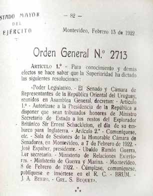 El 3 de febrero, el gobierno del momento encabezado por el doctor Baltasar Brum, envía un mensaje al parlamento para obtener la venia a efectos de rendir honores de Ministro de Estado, en vista de la estima tenida hacia Shackleton por su pasaje por Uruguay. Autorizados los actos el 7 de febrero de ese año, se transcribe en la Orden General del Estado Mayor del Ejército N° 2713, la resolución publicada el 13 de febrero (figura 5).