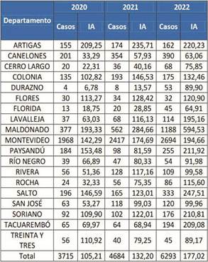 Tabla 1. Número de notificaciones de sífilis según departamento. Uruguay, 2020-2022.