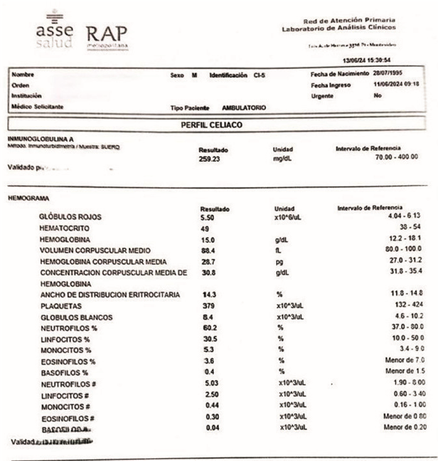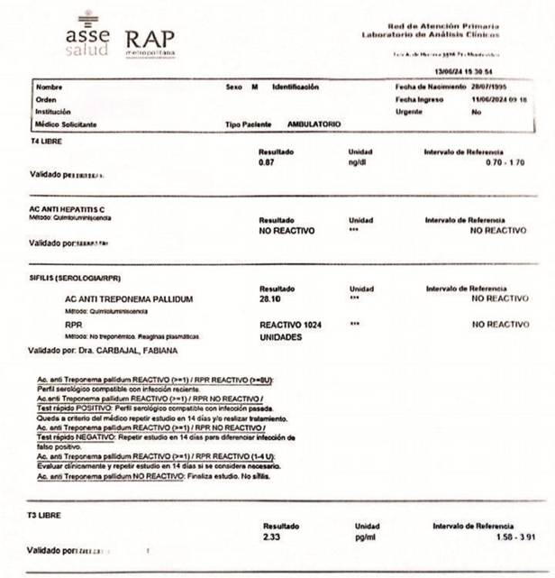 En la zona motivo de consulta, se aprecia en cara ventral de lengua dos placas blanquecinas, una de mayor magnitud en parte media de lengua, y otra de menor extensión en la mitad izquierda de la misma, ambas indoloras (figura 2). Se pregunta al paciente si presenta al momento alguna otra lesión en el cuerpo, lo cual niega. El diagnóstico presuntivo fue de sífilis secundaria, por lo que se solicitó crasis sanguínea y estudios serológicos complementarios de diagnóstico: reacción plasmática rápida (RPR) mide los anticuerpos (AC) liberados por las células huésped dañadas así como también por los treponemas. Dichos AC no sólo se producen como consecuencia de la sífilis sino también en respuesta a enfermedades no treponémicas de naturaleza aguda y crónica donde hay daño tisular. Por dicho motivo se realiza una segunda prueba más específica para detectar AC contra el treponema que causa la sífilis una de ellas es AC anti Treponema pallidum. utilizando el método de la quimioluminiscencia. También hepatitis B, C y VIH a fin de ampliar el protocolo de infecciones de transmisión sexual. El RPR arrojó un valor de 1024 unidades siendo el resultado óptimo: 0–0,001 y la quimioluminiscencia de 28.10 considerando que a partir de 1.0 ya es positiva, mientras que las demás pruebas serológicas resultaron no reactivas (figura 3).